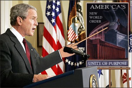 WASHINGTON- President Bush today unveiled the winner of his contest for a poster to be the centerpiece of the Office of Public Diplomacy's program to better acquaint the world with his administration's New World Order policy. Submission of entries was restricted to members of his cabinet. The winning entry came from Vice President Richard "Dick" Cheney. Cheney, who was not present at the ceremony, was linked to it by a secure intercom connection from his bunker at an undisclosed location.