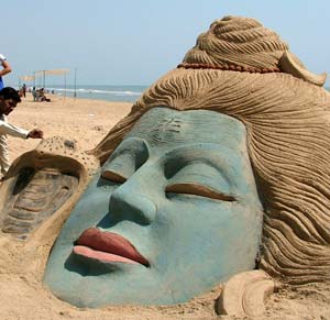 The Hindu deity Shiva as a sand sculpture on a beach in India. To Hindu believers Shiva is the god of destruction and reproduction.